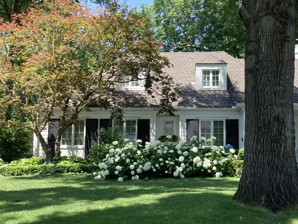 Our inspiration in large part is English gardens, which are informal in nature, and full of curvy shapes, variety and contrasts. In the front we envision a curving hedge of boxwoods for structure (The rendering currently doesn’t show a hedge, but that is our intention.) with tall hydrangeas layered behind tucked up close to the house. In front I would like a variety of shorter perennials. I absolutely love lavender (for its scent and mosquito-repellant qualities), and am definitely wanting to incorporate Black-Eyed Susans, which are the Maryland state flower (where I am originally from). We have a lot of shade, so we definitely have to keep that in mind when making our selections. Hydrangeas are a popular choice in our neighborhood, along with hostas for this reason.